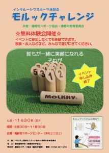 モルックチャレンジを開催いたします。 モルックは年齢や体力に関係なく誰でも参加できます。 お友達・お知り合い・家族などでチームを組みぜひ参加ください。 また当日無料体験もできます。皆様のご参加お待ちしております。 日時:11月30日(日) 開会式:9時00分 試合開始:9時40分 終了:12時00分 会場:高齢者スポーツセンター 資格:町内在住・在勤・在学 ※年齢制限なし 募集:20チーム(※受付終了いたしました。)1チーム4~6人(男女混合可) 賞品:決勝各リーグ1~2位、参加賞(全員)